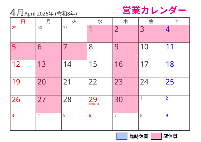 臨時休業の場合はトップページにてお知らせいたします。